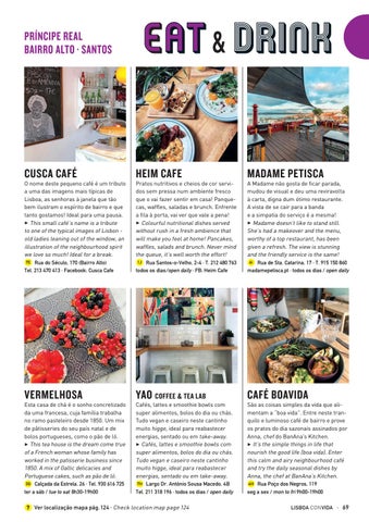 O nome deste pequeno café é um tributo a uma das imagens mais típicas de Lisboa, as senhoras à janela que tão bem ilustram o espírito de bairro e que tanto gostamos! Ideal para uma pausa. 3 This small café’s name is a tribute to one of the typical images of Lisbon old ladies leaning out of the window, an illustration of the neighbourhood spirit we love so much! Ideal for a break. 7E Rua do Século, 170 (Bairro Alto) Tel. 213 470 413 · Facebook: Cusca Cafe