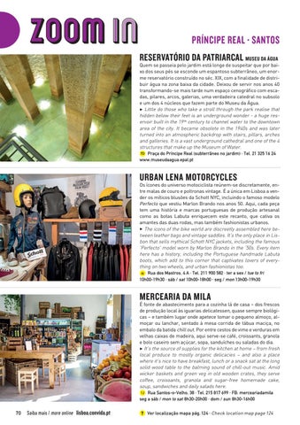 Os ícones do universo motociclista reúnem-se discretamente, entre malas de couro e poltronas vintage. É a única em Lisboa a vender os míticos blusões da Schott NYC, incluindo o famoso modelo Perfecto que vestiu Marlon Brando nos anos 50. Aqui, cada peça tem uma história e marcas portuguesas de produção artesanal como as botas Labuta enriquecem este recanto, que cativa os amantes das duas rodas, mas também fashionistas urbanos. 3 The icons of the bike world are discreetly assembled here between leather bags and vintage saddles. It’s the only place in Lisbon that sells mythical Schott NYC jackets, including the famous 'Perfecto' model worn by Marlon Brando in the ‘50s. Every item here has a history, including the Portuguese handmade Labuta boots, which add to this corner that captivates lovers of everything on two wheels, and urban fashionistas too. 4i Rua dos Mastros, 4 A · Tel. 211 900 582 · ter a sex / tue to fri 10h00-19h30 · sáb / sat 10h00-18h00 · seg / mon 13h00-19h30