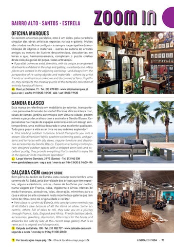 Se existem universos paralelos, este é um deles, pela curadoria singular das obras artísticas expostas na loja e galeria. Muitas são criadas na oficina contígua - e sempre na perspetiva da reutilização de objetos e materiais - outras da autoria de artistas amigos ou mesmo de ilustres desconhecidos, descobertas em feiras e que, harmoniosamente, completam o puzzle criativo desta coleção genial de peças, todas artesanais. 3 If parallel universes exist, then this, with its unique arrangement of artworks exhibited in the shop and gallery, is certainly one. Many pieces are created in the adjoining workshop - and always from the perspective of re-using objects and materials - others by artist friends or an illustrious unknown and discovered at fairs. Together, they complete the creative puzzle of this fantastic collection of entirely handicraft items. 8G Rua Luz Soriano, 71 · Tel. 213 470 003 · www.oficinamarques.pt qua a sex / wed to fri 10h30-18h30 · sáb / sat 13h00-19h30