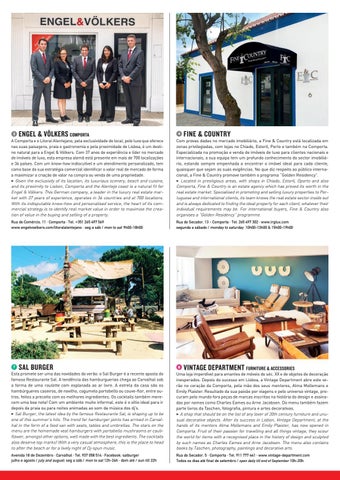 A Comporta e o Litoral Alentejano, pela exclusividade do local, pelo luxo que oferece nas suas paisagens, praia e gastronomia e pela proximidade de Lisboa, é um destino natural para a Engel & Völkers. Com 37 anos de experiência e líder no mercado de imóveis de luxo, esta empresa alemã está presente em mais de 700 localizações e 36 países. Com um know-how indiscutível e um atendimento personalizado, tem como base da sua estratégia comercial identificar o valor real de mercado de forma a maximizar a criação de valor na compra ou venda de uma propriedade. 3 Given the exclusivity of its location, its luxurious scenery, beach and cuisine, and its proximity to Lisbon, Comporta and the Alentejo coast is a natural fit for Engel & Völkers. This German company, a leader in the luxury real estate market with 37 years of experience, operates in 36 countries and at 700 locations. With its indisputable know-how and personalised service, the heart of its commercial strategy is to identify real market value in order to maximise the creation of value in the buying and selling of a property.