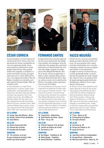 ★ Traça - Baixa (p. 23) ★ Champanheria da Baixa ★ Cervejaria Brasão ★ Serralves (p. 49) ★ Parque da Cidade (p. 63) ★ Igreja do Carmo ★ João Moura Martins Antiguidades ★ Garage Wines - Matosinhos ★ Mercearia das Flores - Baixa (p. 43) PORTO CON VIDA · 9