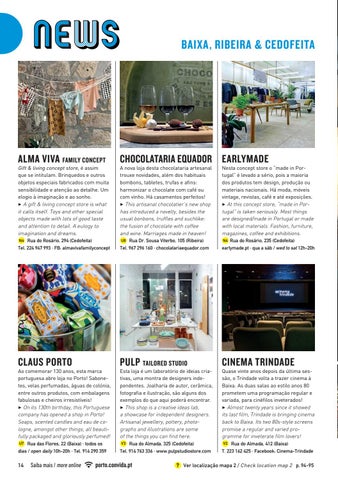 Esta loja é um laboratório de ideias criativas, uma montra de designers independentes. Joalharia de autor, cerâmica, fotografia e ilustração, são alguns dos exemplos do que aqui poderá encontrar. 3 This shop is a creative ideas lab, a showcase for independent designers. Artisanal jewellery, pottery, photographs and illustrations are some of the things you can find here. V3 Rua do Almada, 325 (Cedofeita) Tel. 914 763 336 · www.pulpstudiostore.com