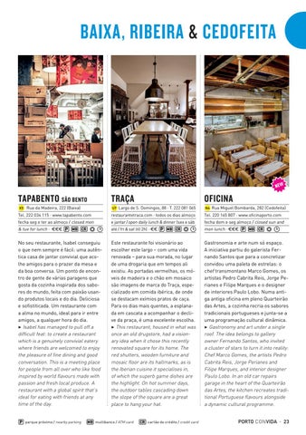 Gastronomia e arte num só espaço. A iniciativa partiu do galerista Fernando Santos que para a concretizar convidou uma paleta de estrelas: o chef transmontano Marco Gomes, os artistas Pedro Cabrita Reis, Jorge Perianes e Filipe Marques e o designer de interiores Paulo Lobo. Numa antiga antiga oficina em pleno Quarteirão das Artes, a cozinha recria os sabores tradicionais portugueses e junta-se a uma programação cultural dinâmica. 3 Gastronomy and art under a single roof. The idea belongs to gallery owner Fernando Santos, who invited a cluster of stars to turn it into reality: Chef Marco Gomes, the artists Pedro Cabrita Reis, Jorge Perianes and Filipe Marques, and interior designer Paulo Lobo. In an old car repairs garage in the heart of the Quarteirão das Artes, the kitchen recreates traditional Portuguese flavours alongside a dynamic cultural programme.