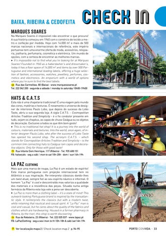 Mais que uma marca de roupa, La Paz é um estado de espírito! Esta marca portuguesa com projeção internacional tem no Atlântico a sua inspiração. Re-interpreta clássicos dando-lhes um twist atual, sempre fiel ao seu espírito náutico e informal. O homem “La Paz” é cool e descontraído mas valoriza a qualidade dos materiais e a resistência das peças. Situada numa antiga farmácia da Ribeira esta loja vale a pena ser descoberta. 3 La Paz is more than a clothing label – it’s a state of mind! This outward-looking Portuguese brand is inspired by the transatlantic style. It reinterprets the classics but with a modern twist, while retaining that nautical and casual spirit. A “La Paz” man is cool and casual, but he cares about the quality of the fabrics and clothes which are hardwearing. Housed in a former pharmacy in Ribeira, by the river, this shop is worth discovering. T9 Rua da Reboleira, 23 (Ribeira) · Tel. 222 025 037 · www.lapaz.pt FB: LaPazClothing · seg a sex/mon to fri 10h-18h & sáb/sat 14h-19h