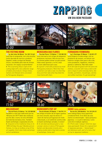 Rua do Almada, 275 (Baixa) · T. 966 974 119 Um antigo armazém de ferragens ganhou um novo conceito: aqui há stores-in-store de marcas portuguesas de moda e decoração, e um ateliê de cozinha onde se fazem workshops variados. A visitar! 3 An old steel warehouse given a new concept: stores-in-store of Portuguese fashion and decoration brands and a cooking studio where they hold a variety of workshops. Come visit!