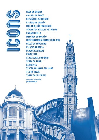 CASA DA MÚSICA COLISEU DO PORTO ESTAÇÃO DE SÃO BENTO ESTÁDIO DO DRAGÃO IGREJA DE SÃO FRANCISCO JARDINS DO PALÁCIO DE CRISTAL LIVRARIA LELLO MERCADO DO BOLHÃO MUSEU NACIONAL SOARES DOS REIS PAÇOS DO CONCELHO PALÁCIO DA BOLSA PARQUE DA CIDADE PONTE LUIZ I SÉ CATEDRAL DO PORTO SERRA DO PILAR SERRALVES TEATRO NACIONAL SÃO JOÃO TEATRO RIVOLI TORRE DOS CLÉRIGOS saiba mais / more online