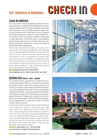 É um dos maiores ícones da cidade e ponto de encontro dos portuenses. O edifício de Rem Koolhaas foi imediatamente adotado pelo Porto e por ali passam muitos dos seus melhores concertos. Música clássica, experimental, pop, eletrónica, ouve-se de tudo um pouco, seguindo uma programação que se dedica a um país diferente todos os anos. É favor não esquecer também o restaurante e o café, diferentes na forma de estar e com propostas gastronómicas deliciosas. Um conselho: faça uma visita guiada. Acontecem diariamente e percorrem todas as faces desta belíssima geometria. 3 One of the city’s most iconic sights and a place where locals gather, this building designed by Rem Koolhaas was immediately adopted by Porto and is the venue for many of its best concerts. Classical, experimental, pop and electronic music, the programme includes every genre and every year is dedicated to a different country. Don’t forget the restaurant and café as well, each with its own separate ambience and delicious menu. A piece of advice: take a guided tour. They’re held every day and visit every area of this beautiful building. K4 Avenida da Boavista, 604 · Tel. 220 120 220 www.casadamusica.com · aberto todos os dias / open daily