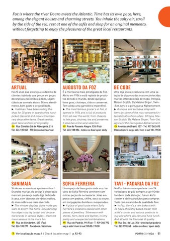Na Foz há uma nova padaria com 24 variedades de pão sempre a sair! Onde também pode almoçar, há um kid’s corner e vários produtos para comprar. Tudo com o carimbo de qualidade Tavi. 3 In Foz, there’s a new bakery with 24 types of freshly baked bread! With a kid’s corner and various products to buy and where you can also have lunch. And all with the Tavi seal of quality. C6 Rua Sra. da Luz, 356 · www.tavi.pt/padaria Tel. 223 198 248 · todos os dias / open daily PORTO CON VIDA · 51