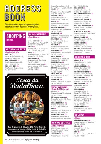 CASA & INTERIORES Home & Interiors A VIDA PORTUGUESA T4 Rua da Galeria de Paris, 20-1º Baixa · Tel. 222 022 105 ARTUAL C6 Rua Cândida Sá de Albergaria, 214 · Foz · Tel. 226 105 843 BUREL U7 Rua de Mouzinho da Silveira, 83 Baixa · Tel. 915 174 710 CASA ALMADA V2 Rua do Almada , 544 · Baixa Tel. 222 010 089 CASA COMIGO INTERIOR DESIGN G3 Av. da Boavista, 2881 · Boavista Tel. 226 106 518 CASSIO - PORTO i6