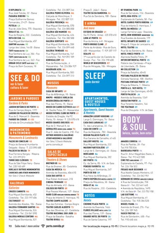 SALAS DE ESPECTÁCULO Theaters & Shows BREYNER 85 N4 Rua do Breiner, 85 · Cedofeita CASA DA MÚSICA K4 Avenida da Boavista, 604-610 CASA DAS ARTES I5 Rua Rúben Andresen, 210 CINEMA TRINDADE V2 Rua do Almada, 412 · Baixa COLISEU DO PORTO Q5 Rua Passos Manuel, 137 · Baixa HARD CLUB MERCADO FERREIRA BORGES T8 Praça do Infante D. Henrique, 95 TEATRO CAMPO ALEGRE J6 Rua das Estrelas · Campo Alegre TEATRO CARLOS ALBERTO T3 Rua das Oliveiras, 43 · Cedofeita TEATRO NACIONAL SÃO JOÃO Z6 Praça da Batalha · Batalha TEATRO RIVOLI X4