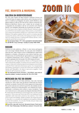 FOZ, BOAVISTA & MARGINAL Na casa onde Sophia de Mello Breyner Andresen brincou em criança há hoje um espaço onde ciência, arte e literatura se fundem e a estética é privilegiada. Em pleno Jardim Botânico, esta galeria explica a vida na Terra de forma criativa e sensorial, podendo-se identificar cheiros, ouvir o bater de um coração, ver o esqueleto de uma baleia e até ter um encontro com Charles Darwin. Um verdadeiro desvendar do mundo que nos rodeia! 3 In the house where Sophia de Mello Breyner Andresen played as a child there now stands a space where science, art and literature merge and aesthetics stands out. In the heart of the Jardim Botânico, this gallery explains life on earth in a creative way that arouses the senses, with smells, the beating of a heart, the skeleton of a whale and even a meeting with Charles Darwin, uncovering the world that surrounds us! i6 Rua do Campo Alegre, 1191 · mhnc.up.pt/galeria-da-biodiversidade Tel. 220 408 700 · terça a domingo / tuesday to sunday 10h00-18h00