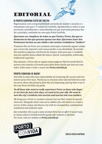 EDITORIAL O PORTO CONVIDA ESTÁ DE VOLTA! Regressamos com a responsabilidade acrescida de manter o sucesso e o entusiasmo com que a 1ª edição foi recebida. Agradecemos a todos os que nos leram e partilharam e, naturalmente aos que marcaram presença desde o princípio, confiando no novo guia Porto ConVida.