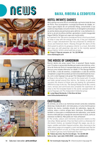 Dormir dentro de umas caves? Sim, é possível! Neste hostel, com 12 suites e camas distribuídas por quatro dormitórios, a história do Vinho do Porto é transportada para os sonhos de quem procura uma estadia diferente na cidade. O The George Restaurant & Bar, a sala de eventos, a esplanada e a sala de convívio completam a experiência deste primeiro branded hostel do mundo, com o selo Sogrape e do grupo The Independent Collective. 3 Sleep in the cellars? Yes, you can! At this hostel with 12 suites and beds spread around four dorms, the history of port wine occupies the dreams of those who are looking for somewhere different to stay in the city. The George Restaurant & Bar, events room, terrace and communal area complete the experience at what is the first branded hostel in the world, stamped with the seal of Sogrape and The Independent Collective group. P8 Largo Miguel Bombarda, 3 (Vila Nova de Gaia) www.thehouseofsandeman.pt