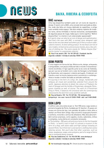Uma loja desportiva também pode ser um ícone de requinte e design. É assim com a BAE, uma concept store pensada ao detalhe, onde não falta um museu dedicado às sapatilhas, o artigo mais vendido neste espaço. São dois andares repletos de modelos raros, séries limitadas e marcas exclusivas, acompanhados de algumas peças de roupa. Sabia que o nome significa “Before Anyone Else” e o mentor é um colecionador apaixonado? 3 A sports shop can also be an icon of design and sophistication. And that’s the case with BAE, a concept store designed right down to the very last detail and where you’ll find a museum dedicated to trainers, its best selling product. Its two floors are full of rare models, limited series and exclusive brands, plus a few articles of clothing too. The name stands for “Before Anyone Else” and its mentor is a passionate collector. Z5 Rua 31 de Janeiro, 250 · Tel. 961 259 422 · Facebook: bae.ftw segunda a sábado / monday to saturday 10h00-19h00