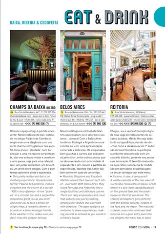 Mauricio Ghiglione e Elisabete Martins apaixonaram-se e selaram o seu amor… à mesa! Com o Belos Aires fundiram Portugal e Argentina numa cozinha só, com uma apresentação esmerada e deliciosa. Há empanadas bem guachas e carnes que seduzem só pelo olhar, entre outros pratos que se vão revezando com criatividade. A copa aberta é um convite à partilha de experiências, fazendo-nos sentir tão bem como em casa de um amigo. 3 Mauricio Ghiglione and Elisabete Martins sealed their love for each other… over food! With Belos Aires, they fused Portugal and Argentina into a single faultless and delicious cuisine. There are tasty empanadas and meat that seduces you just by looking, among other dishes that alternate with creativity. The open design is an invitation to share experiences, making you feel as relaxed as you would in a friend’s house.