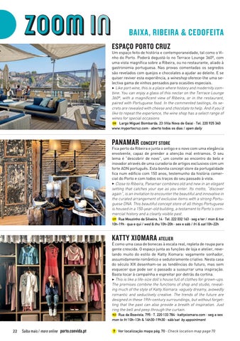 Um espaço feito de história e contemporaneidade, tal como o Vinho do Porto. Poderá degustá-lo no Terrace Lounge 360º, com uma vista magnífica sobre a Ribeira, ou no restaurante, aliado à gastronomia portuguesa. Nas provas comentadas os segredos são revelados com queijos e chocolates a ajudar ao deleite. E se quiser reviver esta experiência, a wineshop oferece-lhe uma selectiva gama de vinhos pensados para ocasiões especiais. 3 Like port wine, this is a place where history and modernity combine. You can enjoy a glass of this nectar on the Terrace Lounge 360º, with a magnificent view of Ribeira, or in the restaurant, paired with Portuguese food. In the commented tastings, its secrets are revealed with cheese and chocolate to help. And if you’d like to repeat the experience, the wine shop has a select range of wines for special occasions O8 Largo Miguel Bombarda, 23 (Vila Nova de Gaia) · Tel. 220 925 340 www.myportocruz.com · aberto todos os dias / open daily