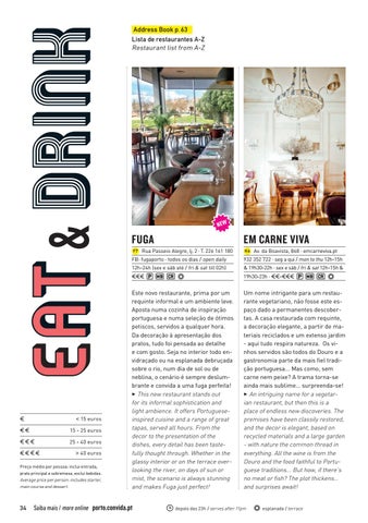 Este novo restaurante, prima por um requinte informal e um ambiente leve. Aposta numa cozinha de inspiração portuguesa e numa seleção de ótimos petiscos, servidos a qualquer hora. Da decoração à apresentação dos pratos, tudo foi pensada ao detalhe e com gosto. Seja no interior todo envidraçado ou na esplanada debruçada sobre o rio, num dia de sol ou de neblina, o cenário é sempre deslumbrante e convida a uma fuga perfeita! 3 This new restaurant stands out for its informal sophistication and light ambience. It offers Portugueseinspired cuisine and a range of great tapas, served all hours. From the decor to the presentation of the dishes, every detail has been tastefully thought through. Whether in the glassy interior or on the terrace overlooking the river, on days of sun or mist, the scenario is always stunning and makes Fuga just perfect!
