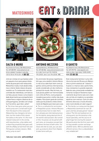 Este restaurante familiar é uma referência há mais de 30 anos em Matosinhos e já tem estatuto de “clássico”! O peixe e o marisco são o ponto forte, mas a lampreia é a grande especialidade da casa, provocando verdadeiras romarias na época! Gostamos especialmente da primeira sala com o balcão corrido em madeira e os grandes aquários com marisco. Com um atendimento atencioso e muito eficiente, este é sem dúvida um valor seguro! 3 This family-run restaurant has been a Matosinhos landmark for over 30 years and has already gained ‘classic’ status! The fish and seafood are its strong point, but the lamprey is the house speciality, and the source of pilgrimage here during the season! We particularly like the first room with its long wooden counter and large shellfish tanks. With its attentive and efficient service, this is undoubtedly a very reliable bet!