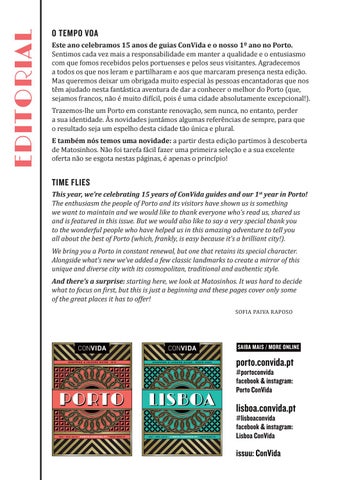O TEMPO VOA Este ano celebramos 15 anos de guias ConVida e o nosso 1º ano no Porto. Sentimos cada vez mais a responsabilidade em manter a qualidade e o entusiasmo com que fomos recebidos pelos portuenses e pelos seus visitantes. Agradecemos a todos os que nos leram e partilharam e aos que marcaram presença nesta edição. Mas queremos deixar um obrigada muito especial às pessoas encantadoras que nos têm ajudado nesta fantástica aventura de dar a conhecer o melhor do Porto (que, sejamos francos, não é muito difícil, pois é uma cidade absolutamente excepcional!). Trazemos-lhe um Porto em constante renovação, sem nunca, no entanto, perder a sua identidade. Às novidades juntámos algumas referências de sempre, para que o resultado seja um espelho desta cidade tão única e plural.