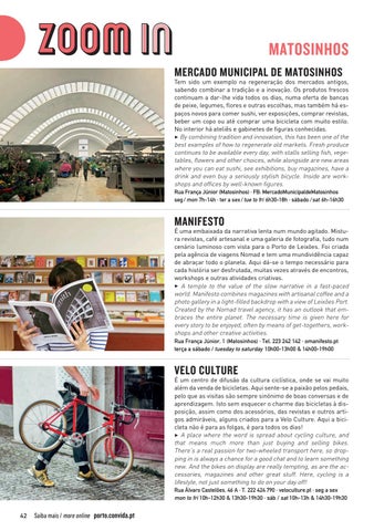 Tem sido um exemplo na regeneração dos mercados antigos, sabendo combinar a tradição e a inovação. Os produtos frescos continuam a dar-lhe vida todos os dias, numa oferta de bancas de peixe, legumes, flores e outras escolhas, mas também há espaços novos para comer sushi, ver exposições, comprar revistas, beber um copo ou até comprar uma bicicleta com muito estilo. No interior há ateliês e gabinetes de figuras conhecidas. 3 By combining tradition and innovation, this has been one of the best examples of how to regenerate old markets. Fresh produce continues to be available every day, with stalls selling fish, vegetables, flowers and other choices, while alongside are new areas where you can eat sushi, see exhibitions, buy magazines, have a drink and even buy a seriously stylish bicycle. Inside are workshops and offices by well-known figures. Rua França Júnior (Matosinhos) · FB: MercadoMunicipaldeMatosinhos seg / mon 7h-14h · ter a sex / tue to fri 6h30-18h · sábado / sat 6h-16h30