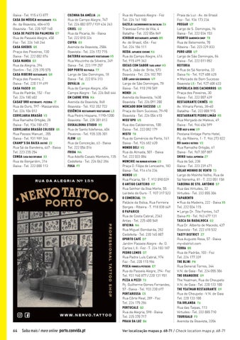 Praia da Luz · Av. do Brasil Foz · Tel. 936 173 234 PREGAR U7 Largo de S. Domingos, 96 Baixa · Tel. 222 034 153 PUORTO SANDWICH SHOP T8 Rua de Belomonte, 70 Ribeira · Tel. 223 229 833 PURO 4050 U7 Largo de São Domingos, 84 Baixa · Tel. 222 011 852 REITORIA • Rua de Sá Noronha, 33 Baixa T4 · Tel. 927 608 628 • Mercado do Bom Sucesso Boavista L5 · Tel. 927 608 633 REPÚBLICA DOS CACHORROS Q5 Praça dos Poveiros, 30 Baixa · Tel. 222 007 639 RESTAURANTE CHINÊS X8 Av. Vímara Peres, 38-40 Batalha · Tel. 222 008 915 RESTAURANTE PEDRO LIMÃO R5 Rua Morgado de Mateus, 49 Baixa · Tel. 966 454 599 RIB BEEF & WINE U9 Pestana Vintage Porto Hotel, Pç. da Ribeira, 1 · T. 966 273 822 RO RAMEN E OUTROS V3 Rua Ramalho Ortigão, 61 Baixa · Tel. 967 307 887 SHIKO TASCA JAPONESA Z7 Rua do Sol, 238 Baixa · Tel. 223 239 671 SOLAR MOINHO DE VENTO T3 Largo do Moinho Velho, Rua de Sá Noronha, 81 · T. 222 051 158 TABERNA DE STO. ANTÓNIO S7 Rua das Virtudes, 32 Virtudes · Tel. 222 055 306 TAPABENTO • Rua da Madeira, 222 · Baixa X5 Tel. 222 034 115 • Largo Dr. Tito Fontes, 147 Baixa P3 · Tel. 963 477 131 TASCA DA BADALHOCA G2 Rua Dr. Alberto de Macedo, 437 Boavista · Tel. 222 618 532 TASTY DISTRICT Z7 Rua Augusto Rosa, 57 · Baixa my-district.com TERRA B5 Rua do Padrão, 103 · Foz Tel. 226 177 339 THE BLINI P8 Rua General Torres, 344 V.N. de Gaia · Tel. 224 055 306 THE ORANGERIE O9 The Yeatman, Rua do Choupelo V.N. de Gaia · Tel. 220 133 100 THE YEATMAN RESTAURANTE O9 Rua do Choupelo · V.N. de Gaia Tel. 220 133 100 TIA ORLANDA T6 Rua das Taipas, 113 Virtudes · Tel. 222 085 710 TOURIGALO F3 Avenida da Boavista, 3206