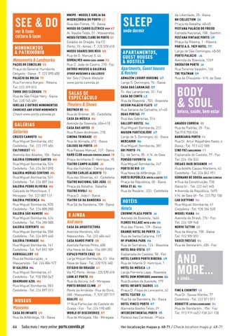 E AINDA And more CASA DA ARQUITECTURA Avenida Menéres, 456 Matosinhos · Tel. 222 404 663 CASA RAMOS PINTO O8 Avenida Ramos Pinto, 400 Vila Nova de Gaia · 936 809 283 ESPAÇO PORTO CRUZ O8 Largo Miguel Bombarda, 23 · Vila Nova de Gaia · Tel. 220 925 340 ESTÁDIO DO DRAGÃO U1 Via FC Porto · Antas · 225 570 418 LOOK AT PORTO R8 Rua da Ancira, 6-8 · Miragaia PORTO BRIDGE CLIMB J7 Ponte da Arrábida · Rua do Ouro, 680 · Massarelos · T. 929 207 117 SEALIFE A2 1ª Rua Particular do Castelo do Queijo · Foz · Tel. 226 190 400 WORLD OF DISCOVERIES R7 Rua de Miragaia, 106 · Miragaia