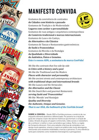MANIFESTO CONVIDA Gostamos da convivência de contrastes de Cidades com história e passado Gostamos de Tradição e de Modernidade Lugares com caráter e personalidade Gostamos de ruas antigas e arquitetura contemporânea de Comércio tradicional e marcas internacionais Gostamos do Luxo e do Castiço, do Alternativo e do Clássico Gostamos de Tascas e Restaurantes gastronómicos de Sushi e Francesinhas Gostamos da Movida e da Nostalgia da Qualidade e Diversidade do Autêntico, Único e Genuíno. Este é o nosso ADN, a assinatura da marca ConVida! We like the contrasts that live side-by-side in Cities with a history and a past We like the Traditional and the Modern Places with character and personality We like ancient streets and contemporary architecture with traditional shops and international brands We like Luxury and the Vernacular, the Alternative and the Classic We like Snack Bars and gourmet Restaurants serving Sushi and ‘Francesinhas’ We like ‘Movida’ and Nostalgia Quality and Diversity the Authentic, Unique and Genuine. That is our DNA, the hallmark of the ConVida brand! SOBRE A CONVIDA - Desde 2003 a ConVida promove o comércio de rua enquanto elemento distintivo e diferenciador. Foi pioneira na criação de guias de compras e lazer dos bairros históricos que formam o coração de Lisboa. Através de guias em papel e online (site, redes sociais e newsletter), dá a conhecer o melhor e mais carismático que Lisboa, Porto e a região da Comporta oferecem. Com uma seleção criteriosa de conteúdos e um design muito apelativo, orienta e inspira um público alvo muito abrangente, oferecendo uma excelente visibilidade a marcas e parceiros. É uma referência tanto para visitantes como residentes (estrangeiros e portugueses).