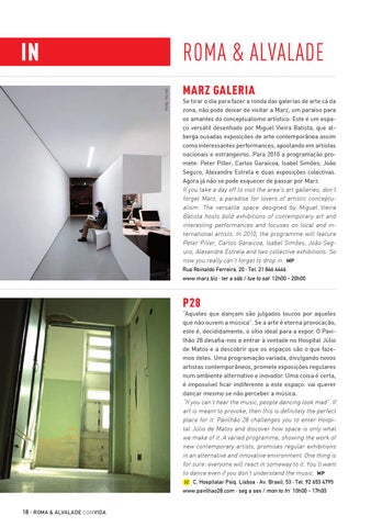 Roma & alvalade Marz Galeria Se tirar o dia para fazer a ronda das galerias de arte cá da zona, não pode deixar de visitar a Marz, um paraíso para os amantes do conceptualismo artístico. Este é um espaço versátil desenhado por Miguel Vieira Batista, que alberga ousadas exposições de arte contemporânea assim como interessantes performances, apostando em artistas nacionais e estrangeiros. Para 2010 a programação promete: Peter Piller, Carlos Garaicoa, Isabel Simões, João Seguro, Alexandre Estrela e duas exposições colectivas. Agora já não se pode esquecer de passar por Marz. If you take a day off to visit the area’s art galleries, don’t forget Marz, a paradise for lovers of artistic conceptualism. The versatile space designed by Miguel Vieira Batista hosts bold exhibitions of contemporary art and interesting performances and focuses on local and international artists. In 2010, the programme will feature Peter Piller, Carlos Garaicoa, Isabel Simões, João Seguro, Alexandre Estrela and two collective exhibitions. So now you really can’t forget to drop in. MP Rua Reinaldo Ferreira, 20 · Tel. 21 846 4446 www.marz.biz · ter a sáb / tue to sat 12h00 - 20h00