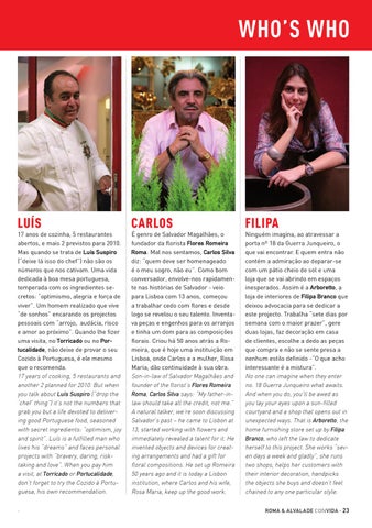 É genro de Salvador Magalhães, o fundador da florista Flores Romeira Roma. Mal nos sentamos, Carlos Silva diz: “quem deve ser homenageado é o meu sogro, não eu”. Como bom conversador, envolve-nos rapidamente nas histórias de Salvador - veio para Lisboa com 13 anos, começou a trabalhar cedo com flores e desde logo se revelou o seu talento. Inventava peças e engenhos para os arranjos e tinha um dom para as composições florais. Criou há 50 anos atrás a Romeira, que é hoje uma instituição em Lisboa, onde Carlos e a mulher, Rosa Maria, dão continuidade à sua obra. Son-in-law of Salvador Magalhães and founder of the florist’s Flores Romeira Roma, Carlos Silva says: “My father-inlaw should take all the credit, not me.” A natural talker, we’re soon discussing Salvador’s past – he came to Lisbon at 13, started working with flowers and immediately revealed a talent for it. He invented objects and devices for creating arrangements and had a gift for floral compositions. He set up Romeira 50 years ago and it is today a Lisbon institution, where Carlos and his wife, Rosa Maria, keep up the good work.