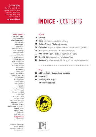 4 Editorial 6 News últimas novidades / latest news 11 Cultura & Lazer / Culture & Leisure 14 Eating Out sugestões de restaurantes / restaurant suggestions 18 IN lugares em destaque / places worth visiting 22 Who’s Who 4 perfis do bairro / portrait of 4 locals 24 Zapping 24 horas de dicas / a full day of tips 26 Shopping a nossa selecção de compras / our shopping selection