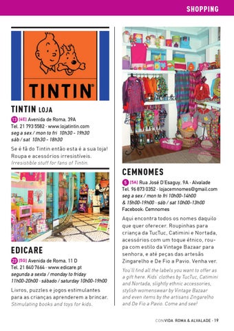 Aqui encontra todos os nomes daquilo que quer oferecer. Roupinhas para criança da TucTuc, Catimini e Nortada, acessórios com um toque étnico, roupa com estilo da Vintage Bazaar para senhora, e até peças das artesãs Zingarelho e De Fio a Pavio. Venha ver. You’ll find all the labels you want to offer as a gift here. Kids’ clothes by TucTuc, Catimini and Nortada, slightly ethnic accessories, stylish womenswear by Vintage Bazaar and even items by the artisans Zingarelho and De Fio a Pavio. Come and see! con vida roma & alvalade · 19