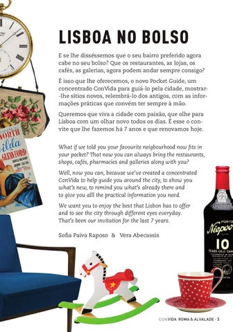 LISBOA NO BOLSO E se lhe disséssemos que o seu bairro preferido agora cabe no seu bolso? Que os restaurantes, as lojas, os cafés, as galerias, agora podem andar sempre consigo? É isso que lhe oferecemos, o novo Pocket Guide, um concentrado ConVida para guiá-lo pela cidade, mostrar-lhe sítios novos, relembrá-lo dos antigos, com as informações práticas que convém ter sempre à mão. Queremos que viva a cidade com paixão, que olhe para Lisboa com um olhar novo todos os dias. É esse o convite que lhe fazemos há 7 anos e que renovamos hoje. What if we told you your favourite neigbourhood now fits in your pocket? That now you can always bring the restaurants, shops, cafés, pharmacies and galleries along with you? Well, now you can, because we’ve created a concentrated ConVida to help guide you around the city, to show you what’s new, to remind you what’s already there and to give you alll the practical information you need. We want you to enjoy the best that Lisbon has to offer and to see the city through different eyes everyday. That’s been our invitation for the last 7 years. Sofia Paiva Raposo & Vera Abecassis