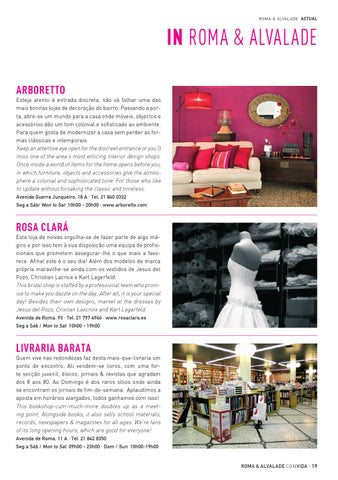 IN ROMA & ALVALADE Arboretto Esteja atento à entrada discreta, não vá falhar uma das mais bonitas lojas de decoração do bairro. Passando a porta, abre-se um mundo para a casa onde móveis, objectos e acessórios dão um tom colonial e sofisticado ao ambiente. Para quem gosta de modernizar a casa sem perder as formas clássicas e intemporais. Keep an attentive eye open for the discreet entrance or you’ll miss one of the area’s most enticing interior design shops. Once inside a world of items for the home opens before you, in which furniture, objects and accessories give the atmosphere a colonial and sophisticated tone. For those who like to update without forsaking the classic and timeless. Avenida Guerra Junqueiro, 18 A · Tel. 21 840 0332 Seg a Sáb/ Mon to Sat 10h00 - 20h00 · www.arboretto.com