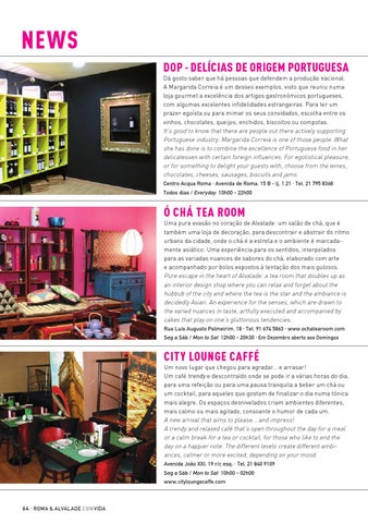 City Lounge Caffé Um novo lugar que chegou para agradar... e arrasar! Um café trendy e descontraído onde se pode ir a várias horas do dia, para uma refeição ou para uma pausa tranquila a beber um chá ou um cocktail, para aqueles que gostam de finalizar o dia numa tónica mais alegre. Os espaços desnivelados criam ambientes diferentes, mais calmo ou mais agitado, consoante o humor de cada um. A new arrival that aims to please... and impress! A trendy and relaxed café that’s open throughout the day for a meal or a calm break for a tea or cocktail, for those who like to end the day on a happier note. The different levels create different ambiances, calmer or more excited, depending on your mood. Avenida João XXI, 19 r/c esq. · Tel. 21 840 9109 Seg a Sáb / Mon to Sat 10h00 - 02h00 www.cityloungecaffe.com