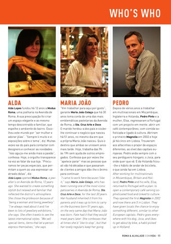 Depois de vários anos a trabalhar em multinacionais em Moçambique, Inglaterra e Holanda, Pedro Pinto e a mulher, Elsa, regressaram a Portugal com um projecto em mente: abrir um café contemporâneo, com comida sofisticada e ligado à cultura. Abriram o primeiro Magnolia em 2002 e hoje já há cinco em Lisboa. Trouxeram aos alfacinhas o prazer de espaços diferentes, ao nível das capitais europeias. Pedro anda sempre com o seu perdigueiro húngaro, o Joca, para onde quer que vá. E da Holanda ficou-lhe o hábito de andar de bicicleta, o que ainda faz em Lisboa. After working for multinationals in Mozambique, Britain and Holland, Pedro Pinto and his wife, Elsa, returned to Portugal with a plan: to open a contemporary café serving sophisticated food and linked to culture. They opened the first Magnolia in 2002 and now there are 5 in Lisbon. They have given locals the chance to enjoy something different, similar to other European capitals. Pedro goes everywhere with his dog, Joca, and likes to get about by bike, a habit picked up in Holland. roma & alvalade con vida · 11