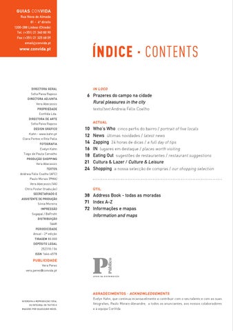 Who’s Who cinco perfis do bairro / portrait of five locals News últimas novidades / latest news Zapping 24 horas de dicas / a full day of tips IN lugares em destaque / places worth visiting Eating Out sugestões de restaurantes / restaurant suggestions Cultura & Lazer / Culture & Leisure Shopping a nossa selecção de compras / our shopping selection