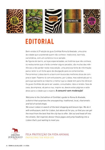 EDITORIAL Bem-vindos à 2ª edição do guia ConVida Roma & Alvalade, uma zona da cidade que surpreende quem não conhece: tradicional, bairrista, carismática, com um comércio rico e variado. As figuras do bairro, as lojas especializadas, as histórias que não conhece, os restaurantes que o farão cometer alguns pecados, são muitas das referências a não perder nesta nova edição: uma preciosa fonte de informação para o leitor e um forte apoio de divulgação para os comerciantes. Percorremos Lisboa bairro a bairro em busca das melhores dicas de compras e lazer. Fazemo-lo com entusiasmo, por Lisboa, mas sobretudo por si, para que aproveite ao máximo o melhor que a cidade tem para lhe oferecer. Os guias ConVida são para ser usados, consultados, lidos e relidos. Saia de casa, da empresa, vá para a rua, inspire-se, devore estas páginas e salte delas para a cidade que o espera. A consumir sem moderação! Welcome to the 2nd edition of ConVida’s guide to Roma & Alvalade, a district that surprises the unsuspecting: traditional, local, charismatic and full of varied shops. We scour Lisbon in search of the best shopping and leisure tips. We do it with enthusiasm, both for Lisbon, but above all for you, so that you can get the most from the best that the city has to offer. Get out and head off into the streets. Get inspired, devour these pages and jump headlong into a Lisbon that’s just waiting to meet you.