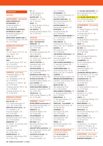 correios · post offices • Avenida da Igreja, 13 5A Tel. 21 842 8690 • Av. da República, 99 D 1 E Tel. 21 799 5162 • Avenida E U A, 105 B-C 4 D Tel. 21 799 5150 • Avenida João XXI, 78 B-C 3 H Tel. 21 799 0570 • Avenida de Roma, 9 C 4 G Tel. 21 842 8970 Gráficas & cópias printer & print center