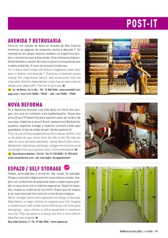 Espazo / Self Storage Sótãos, arrecadações e armários são coisas do passado. Chegou a solução mágica para ter a sua vida arrumada. Imagine um condomínio de pequenas salas à espera para guardar os seus bens com a máxima segurança. Sejam brinquedos, roupas ou material de escritório. Dizem que ter espaço é um luxo mas este fica mais em conta do que imagina. Attics, storage rooms and cupboards are things of the past. Now there’s a magic solution to organize your life. Imagine a condominium with small rooms where you can store your belongings - toys, clothes or office equipment in maximum security. They say space is a luxury, but this is more affordable than you imagine. M Rua João Saraiva, 5 · Tel. 21 846 3034 · www.espazo.pt ROMA & ALVALADE con vida · 19