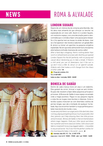 Roma & alvalade London Square Depois de um intenso dia de compras pela Avenida, não há ideia mais atraente do que almoçar ou lanchar na esplanada de um novo café. Assim é o London Square, um novíssimo espaço, com uma decoração jovem e descontraída que o convida a fazer uma pausa para relaxar. Se o frio apertar tem as mesas no andar de baixo, mas se o Sol aparecer não resista a saborear um gelado Ben & Jerry’s ou tomar um aperitivo na pequena simpática esplanada. Vai ver que esta calma londrina é uma óptima alternativa à confusão mexicana de outros cafés! After a hard day’s shopping, there’s nothing better than lunch or refreshments at a new café. And the just opened London Square fits the bill perfectly, with its young and casual decor beckoning you to take a break. If there’s a chill wind, you can sit downstairs, but if the sun is up don’t miss a Ben & Jerry’s or an aperitif outside. Orderly calm that makes a nich change from the chaos of other cafés! M 5I