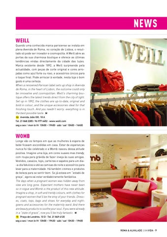 news Weill Quando uma conhecida marca parisiense se instala em plena Avenida de Roma, no coração de Lisboa, o resultado só pode ser inovador e cosmopolita. A Weill abre as portas da sua charmosa boutique e oferece as últimas tendências vindas directamente da cidade das luzes. Marca existente desde 1892, a Weill surpreende pela actualidade, com peças de corte original e cores arrojadas como azul forte ou roxo, e acessórios únicos para o toque final. Pode arriscar à vontade, nesta loja o bom gosto é uma certeza. When a renowned Parisian label sets up shop in Avenida de Roma, in the heart of Lisbon, the outcome could only be innovative and cosmopolitan. Weill’s charming boutique offers the latest trends direct from the city of light. Set up in 1892, the clothes are up-to-date, original and bold in colour, and the unique accessories ideal for that finishing touch. And you needn’t worry: everything is in the best possible taste. M 9H