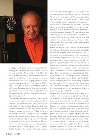 sou gago!’, e ele disse-me ‘Um gajo quando canta não gagueja, também não vais gaguejar’, e eu lá fui, para a minha estreia, numa peça de Alves Redol. Gaguejei tanto que as pessoas riram imenso. E aquilo era um drama! Fez um sucesso, tive imenso tempo no palco por causa do gaguejar. Ficou resolvido que eu era um cómico.” Era o ano de 1947, e logo a seguir Raúl participou noutra peça, desta vez de Tchekov. Para exercitar as falas, começou a ler o jornal uma hora por dia, muito devagar. Foi assim que se treinou para o futuro. “Mas ainda sou gago”, diz, “aliás, vivo disso!” O salto para o teatro não foi imediato. “O meu sonho era ser médico”, conta, “tinha uma fantasia desde pequeno, por gostar muito do nosso médico, que vivia ali ao pé, o Américo de Assunção. Era coxo, chamava-lhe doutor coxinho. Dava por ele quando subia as escadas, toc-toc toc-toc.” Mas, “como era hábito naquela altura”, conta Raúl, “os pais tinham aquela frase genial para os filhos ‘O menino não tem quereres!’, por isso, tive que ir para uma escola comercial tirar um curso, que detestei. Ele queria dar-me a herança da pequena fábrica, achava que seria minha, e tinha alguma razão...”. Depois de tirar o curso, esteve como empregado no escri8 · santos con vida
