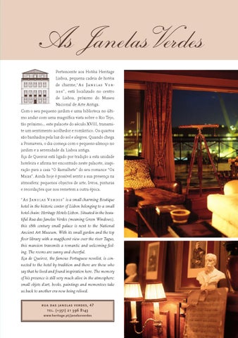 AsJanelasVer des Pertencente aos Hotéis Heritage Lisboa, pequena cadeia de hotéis de charme,“As Janelas Verdes”, está localizado no centro de Lisboa, próximo do Museu Nacional de Arte Antiga. Com o seu pequeno jardim e uma biblioteca no último andar com uma magnífica vista sobre o Rio Tejo, tão próximo... este palacete do século XVIII, transmite um sentimento acolhedor e romântico. Os quartos são banhados pela luz do sol e alegres. Quando chega a Primavera, o dia começa com o pequeno-almoço no jardim e a serenidade da Lisboa antiga. Eça de Queiroz está ligado por tradição a esta unidade hoteleira e afirma ter encontrado neste palacete, inspiração para a casa “O Ramalhete” do seu romance “Os Maias”. Ainda hoje é possível sentir a sua presença na atmosfera: pequenos objectos de arte, livros, pinturas e recordações que nos remetem a outra época. “As Janelas Verdes” is a small charming Boutique hotel in the historic center of Lisbon belonging to a small hotel chain: Heritage Hotels Lisbon. Situated in the beautiful Rua das Janelas Verdes (meaning Green Windows), this 18th century small palace is next to the National Ancient Art Museum. With its small garden and the top floor library with a magificent view over the river Tagus, this mansion transmits a romantic and welcoming feeling. The rooms are sunny and cheerful. Eça de Queiroz, the famous Portuguese novelist, is connected to the hotel by tradition and there are those who say that he lived and found inspiration here. The memory of his presence is still very much alive in the atmosphere: small objets d’art, books, paintings and mementoes take us back to another era now being relived. rua das janelas verdes, 47 tel. (+351) 21 396 8143 www.heritage.pt/janelasverdes santos con vida · 19