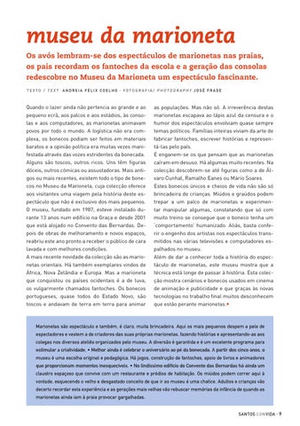 Marionetas são espectáculo e também, é claro, muita brincadeira. Aqui os mais pequenos despem a pele de espectadores e vestem a de criadores das suas próprias marionetas, fazendo histórias e apresentando-as aos colegas nos diversos ateliês organizados pelo museu. A diversão é garantida e é um excelente programa para estimular a criatividade. • Melhor ainda é celebrar o aniversário ao pé da bonecada. A partir dos cinco anos, o museu é uma escolha original e pedagógica. Há jogos, construção de fantoches, apoio de livros e animadores que proporcionam momentos inesquecíveis. • No lindíssimo edifício do Convento das Bernardas há ainda um claustro espaçoso que convive com um restaurante e prédios de habitação. Os miúdos podem correr aqui à vontade, esquecendo o velho e desgastado conceito de que ir ao museu é uma chatice. Adultos e crianças vão decerto recordar esta experiência e as gerações mais velhas vão rebuscar memórias da infância de quando as marionetas ainda iam à praia provocar gargalhadas. SANTOS con vida · 9