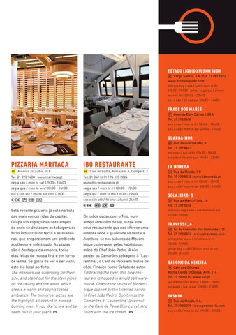 Esta recente pizzaria já está na lista das mais concorridas da capital. Ocupa um espaço bastante amplo, de onde se destacam as tubagens de ferro industrial do tecto e as madeiras, que proporcionam um ambiente acolhedor e sofisticado. As pizzas são o destaque da ementa, todas elas feitas de massa fina e em forno de lenha. Se gosta de ver e ser visto, este é o local perfeito. The interiors are surprising for their size, and stand out for the steel pipes on the ceiling and the wood, which create a warm and sophisticated ambiance. The thin crust pizzas are the highlight, all cooked in a woodburning oven. If you like to see and be seen, this is your place. PS