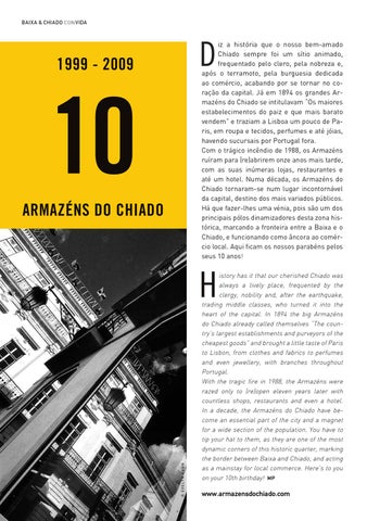 iz a história que o nosso bem-amado Chiado sempre foi um sítio animado, frequentado pelo clero, pela nobreza e, após o terramoto, pela burguesia dedicada ao comércio, acabando por se tornar no coração da capital. Já em 1894 os grandes Armazéns do Chiado se intitulavam “Os maiores estabelecimentos do paiz e que mais barato vendem” e traziam a Lisboa um pouco de Paris, em roupa e tecidos, perfumes e até jóias, havendo sucursais por Portugal fora. Com o trágico incêndio de 1988, os Armazéns ruíram para (re)abrirem onze anos mais tarde, com as suas inúmeras lojas, restaurantes e até um hotel. Numa década, os Armazéns do Chiado tornaram-se num lugar incontornável da capital, destino dos mais variados públicos. Há que fazer-lhes uma vénia, pois são um dos principais pólos dinamizadores desta zona histórica, marcando a fronteira entre a Baixa e o Chiado, e funcionando como âncora ao comércio local. Aqui ficam os nossos parabéns pelos seus 10 anos!