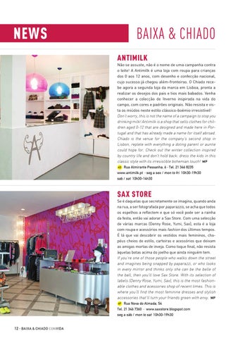 baixa & chiado Antimilk Não se assuste, não é o nome de uma campanha contra o leite! A Antimilk é uma loja com roupa para crianças dos 0 aos 12 anos, com desenho e confecção nacional, cujo sucesso já chegou além-fronteiras. O Chiado recebe agora a segunda loja da marca em Lisboa, pronta a realizar os desejos dos pais e tios mais babados. Venha conhecer a colecção de Inverno inspirada na vida do campo, com cores e padrões originais. Não resista e vista os miúdos neste estilo clássico-boémio irresistível! Don’t worry, this is not the name of a campaign to stop you drinking milk! Antimilk is a shop that sells clothes for children aged 0-12 that are designed and made here in Portugal and that has already made a name for itself abroad. Chiado is the venue for the company’s second shop in Lisbon, replete with everything a doting parent or auntie could hope for. Check out the winter collection inspired by country life and don’t hold back: dress the kids in this classic style with its irresistible bohemian touch! MP 4D