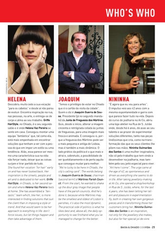 “É agora que eu vou para artes”. O impulso veio aos 42 anos com a mesma espontaneidade e garra com que parece fazer tudo na vida. Depois do curso de joalharia no Ar.Co, abriu uma loja-atelier na Rua de S. Julião onde, desde há 6 anos, dá asas ao seu talento e ao prazer de experimentar soluções diferentes, tanto nas peças lindíssimas que cria, como na transformação das que os seus clientes lhe põem nas mãos. Nininha Guimarães dos Santos é uma mulher inspiradora, não só pelo trabalho que tem vindo a desenvolver na joalharia, mas também pelo seu jeito especial para viver. “Art here I come”. The urge came at the age of 42, as spontaneous and driven as everything she seems to do in life. After taking jewellery-making at Ar.Co, she opened a shop/workshop in Rua de S. Julião, where, for the last 6 years, she has been letting her talent and pleasure in experimentation fly, both in creating her own gorgeous pieces and in transforming those her customers bring her. Nininha Guimarães dos Santos is an inspiration, not only for the jewellery she makes, but also for her special joi de vivre. baiX A & CHIADO con vida · 25