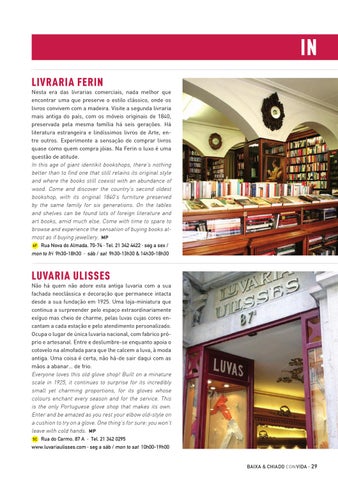 IN Livraria Ferin Nesta era das livrarias comerciais, nada melhor que encontrar uma que preserve o estilo clássico, onde os livros convivem com a madeira. Visite a segunda livraria mais antiga do país, com os móveis originais de 1840, preservada pela mesma família há seis gerações. Há literatura estrangeira e lindíssimos livros de Arte, entre outros. Experimente a sensação de comprar livros quase como quem compra jóias. Na Ferin o luxo é uma questão de atitude. In this age of giant identikit bookshops, there’s nothing better than to find one that still retains its original style and where the books still coexist with an abundance of wood. Come and discover the country’s second oldest bookshop, with its original 1840’s furniture preserved by the same family for six generations. On the tables and shelves can be found lots of foreign literature and art books, amid much else. Come with time to spare to browse and experience the sensation of buying books almost as if buying jewellery. MP 6F