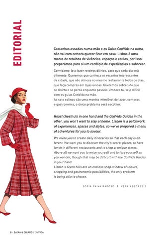 Roast chestnuts in one hand and the ConVida Guides in the other, you won’t want to stay at home. Lisbon is a patchwork of experiences, spaces and styles, so we’ve prepared a menu of adventures for you to savour. We invite you to create daily itineraries so that each day is different. We want you to discover the city’s secret places, to have lunch in different restaurants and to shop at unique stores. Above all we want you to enjoy yourself and to lose yourself as you wander, though that may be difficult with the ConVida Guides in your hand. Lisbon’s seven hills are an endless shop-window of leisure, shopping and gastronomic possibilities, the only problem is being able to choose. S o f i a P a i va R ap o s o